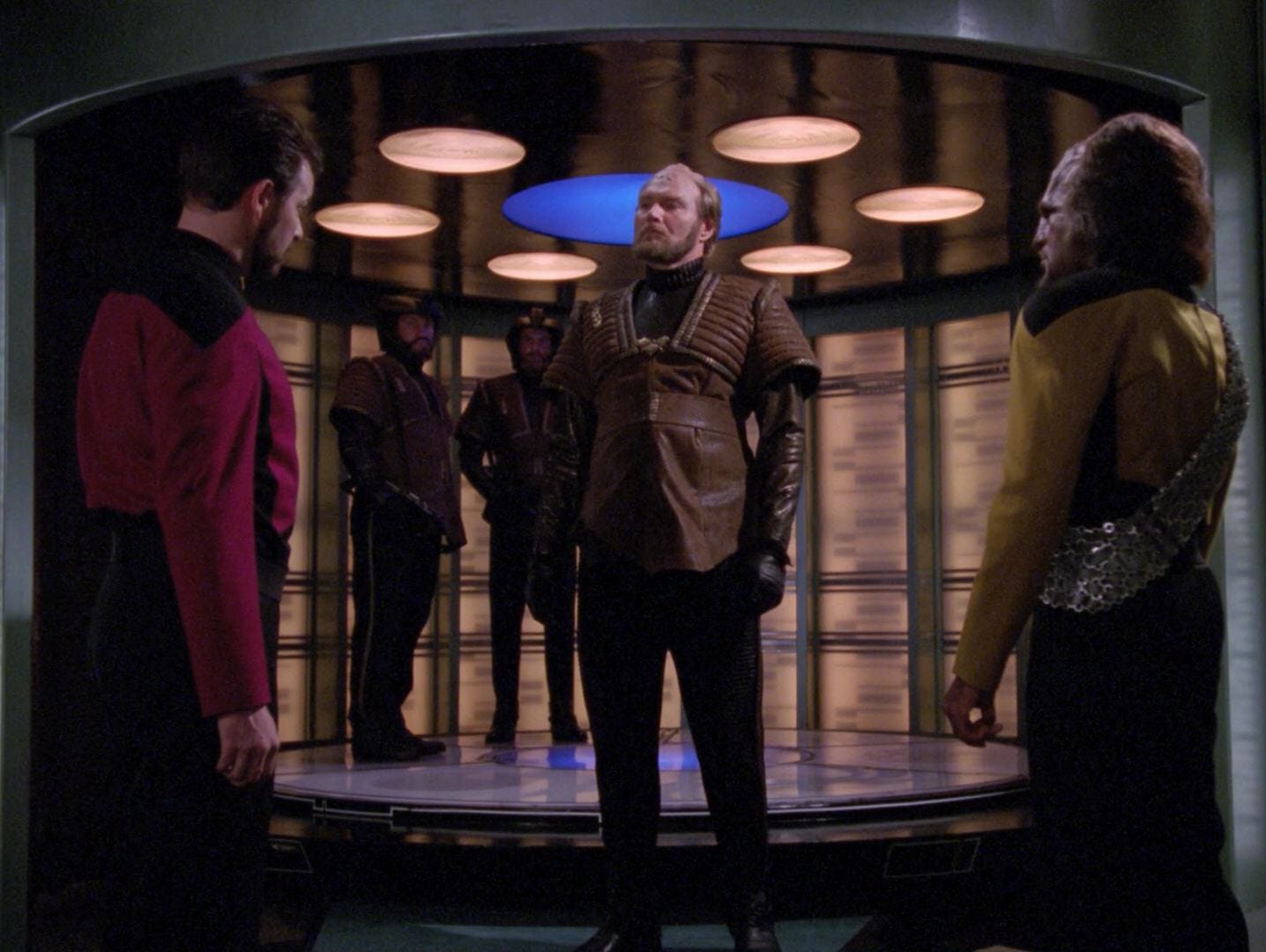 Taylor originally wanted to call the alien race ‘Phrygians’, presumably after the Bronze Age culture that lived in what is now called Turkey (or possibly after that wonderful composition ‘Adagio of Spartacus and Phrygia’, which is one of my favourite pieces of music…) However, Michael Okuda was always looking to keep the lore a little tighter and encouraged her to pick ‘Talarian’ because they'd been mentioned but not seen back in the first season episode “Heart of Glory”. The font and emblem seen in that earlier episode reappear here, and this commitment to reusing lore fragments and their associated props becomes more and more common now that Rick Berman is in charge.