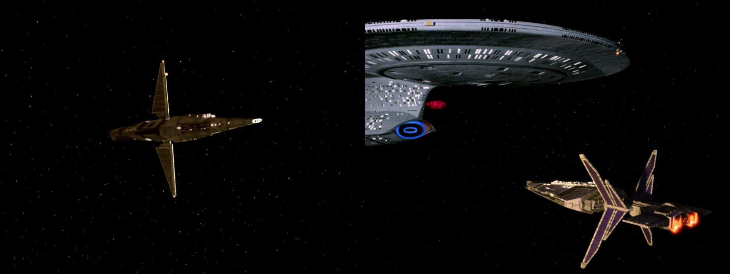 They’re lovely, and both will see a lot of service elsewhere in TNG and beyond, although we’ll only see the sailboat-inspired Observation Craft (left) only once more in TNG. However, the Warship (right) has five more TNG appearances, and both crop up in DS9 and Voyager many times as well. That’s how it is you get a new model in a show that is otherwise trying to conserve budget: you promise the producers that you’ll definitely find a way to use them again!