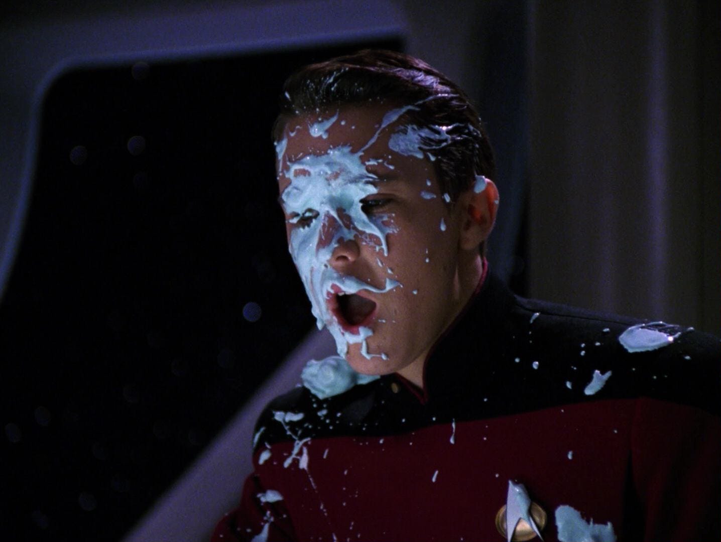 Oh, and before we finish talking about the guest stars, let’s not forget that Jono manages to strike Wesley Crusher in the face with a banana split.