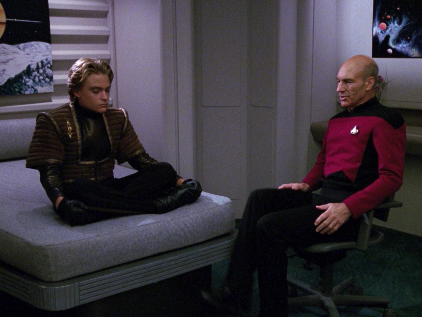 By an astonishing coincidence that has everyone saying ‘wow, what a small galaxy this is’, Jono is not only biologically human but related to a Starfleet Admiral. It all sets up a tug of war between the Federation and the Talarians during which there’s a lot of tongue wagging and hand-wringing until eventually Picard gets stabbed (again), which is more than he deserves after thinking that the right thing to do with a warrior child is to teach him how to play squash.