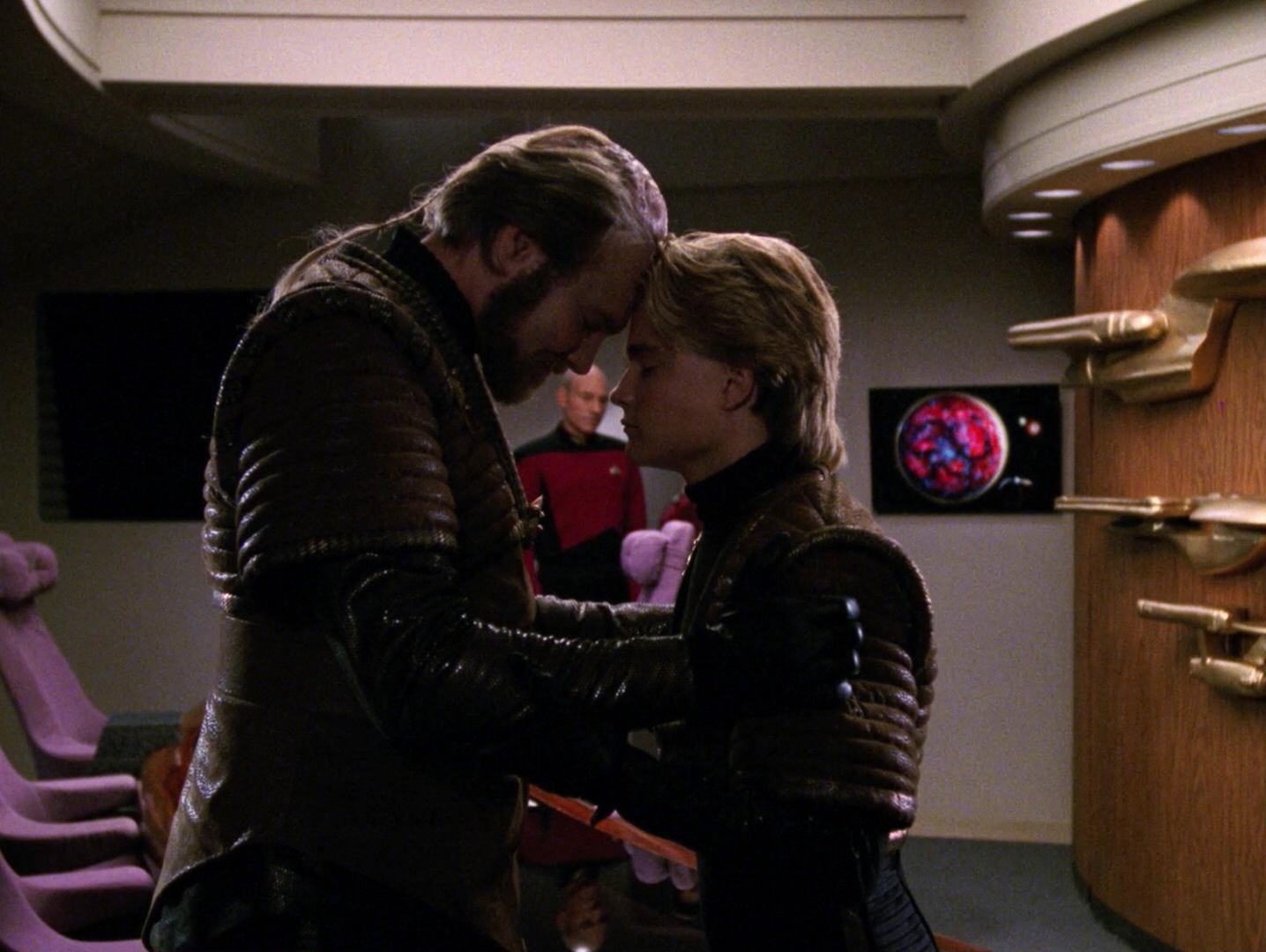 The thematic thrust of the story is an interesting one, and in many respects much more so than the plot, which plods along quite unremarkably. But the question of ties of blood versus ties of kinship is an engaging one, and it’s brave of this episode to make the Talarians the kind of culture most folks in the audience would repudiate (patriarchal, misogynistic, violent, apparently untrustworthy) yet still end the show by leaving Jono with his adoptive father. This is perhaps what I most respect in this story, because it took a certain courage to take this line. Indeed, the show got a lot of letters of complaint about it allegedly condoning child abuse. As Rick Berman recalled about it: